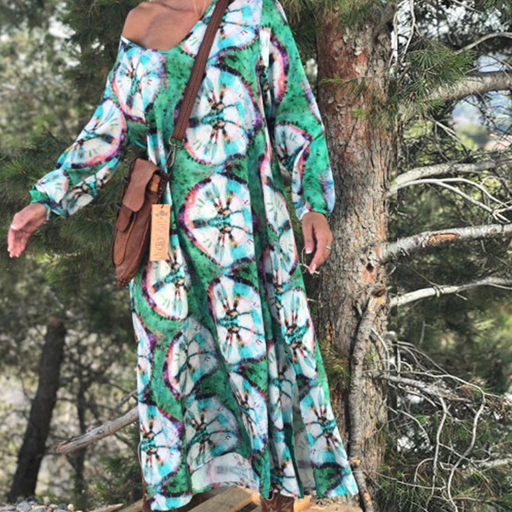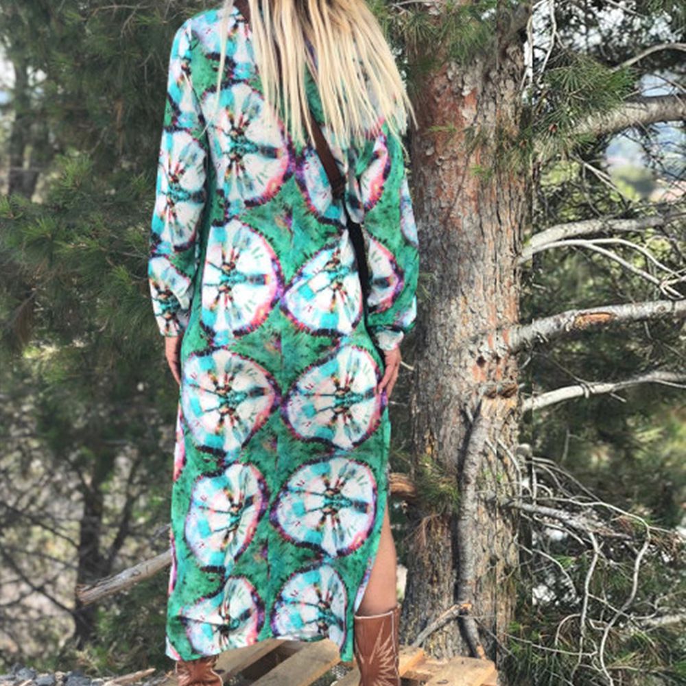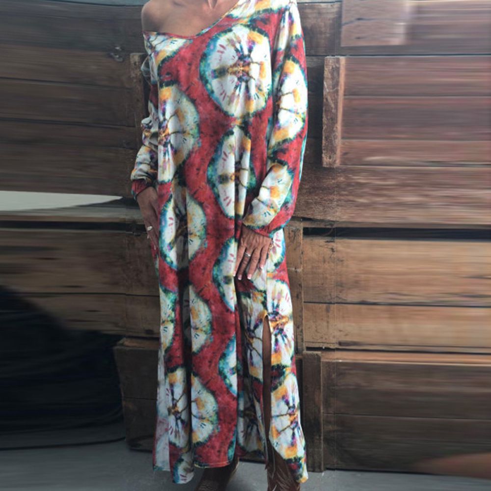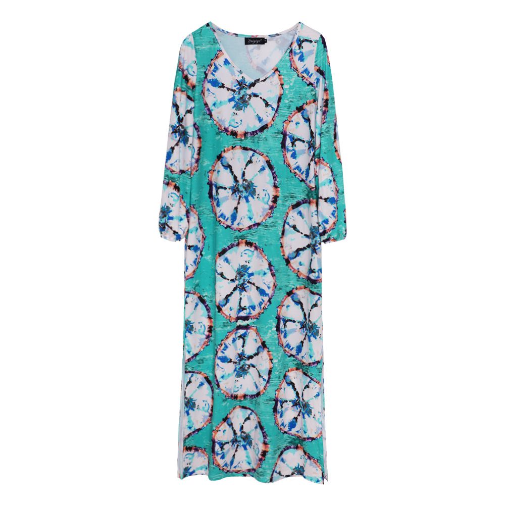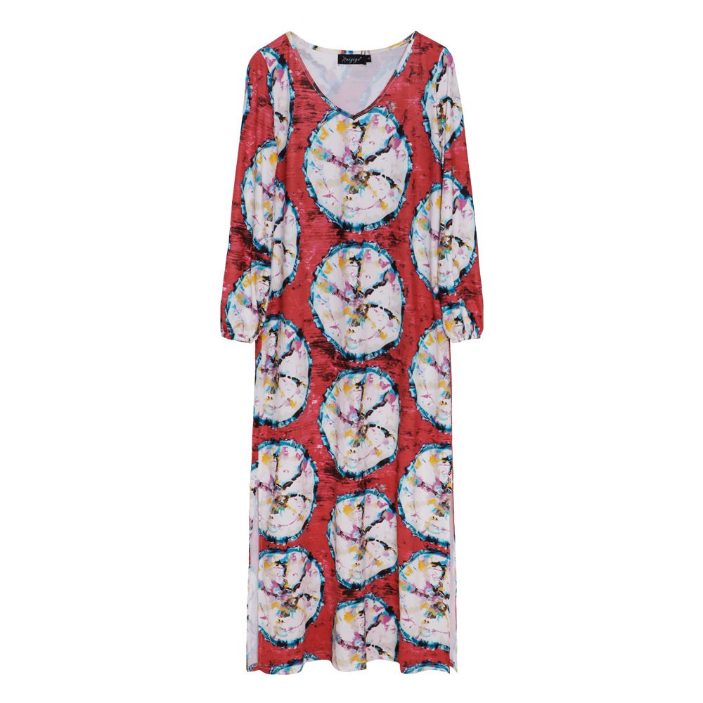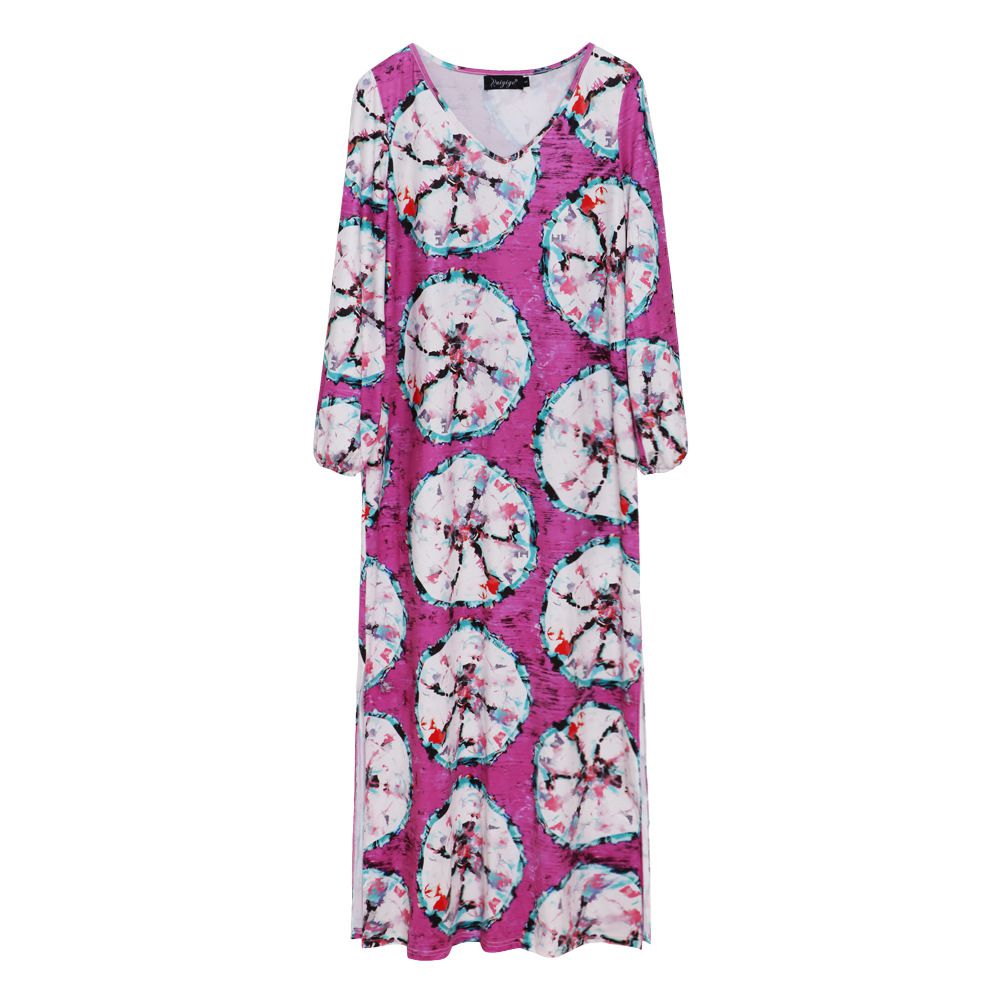 2025 autumn and winter new women's long-sleeved loose v-neck printed large size women's dress