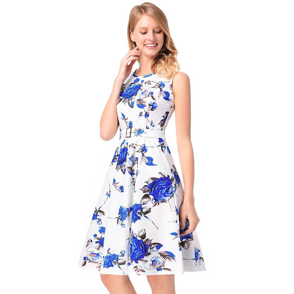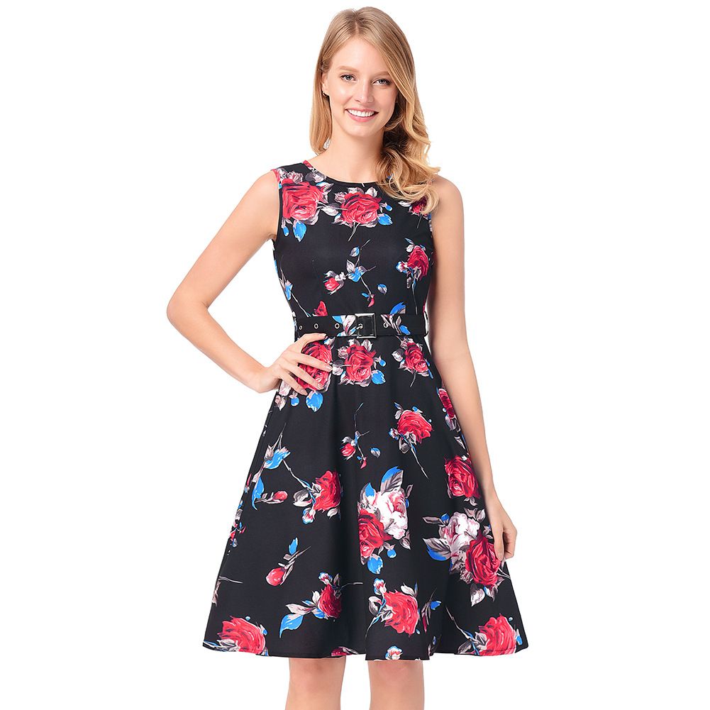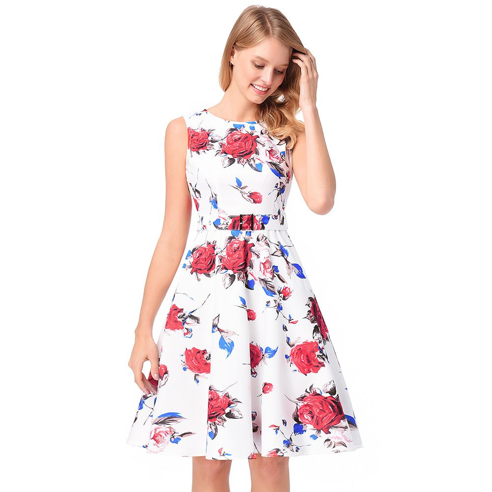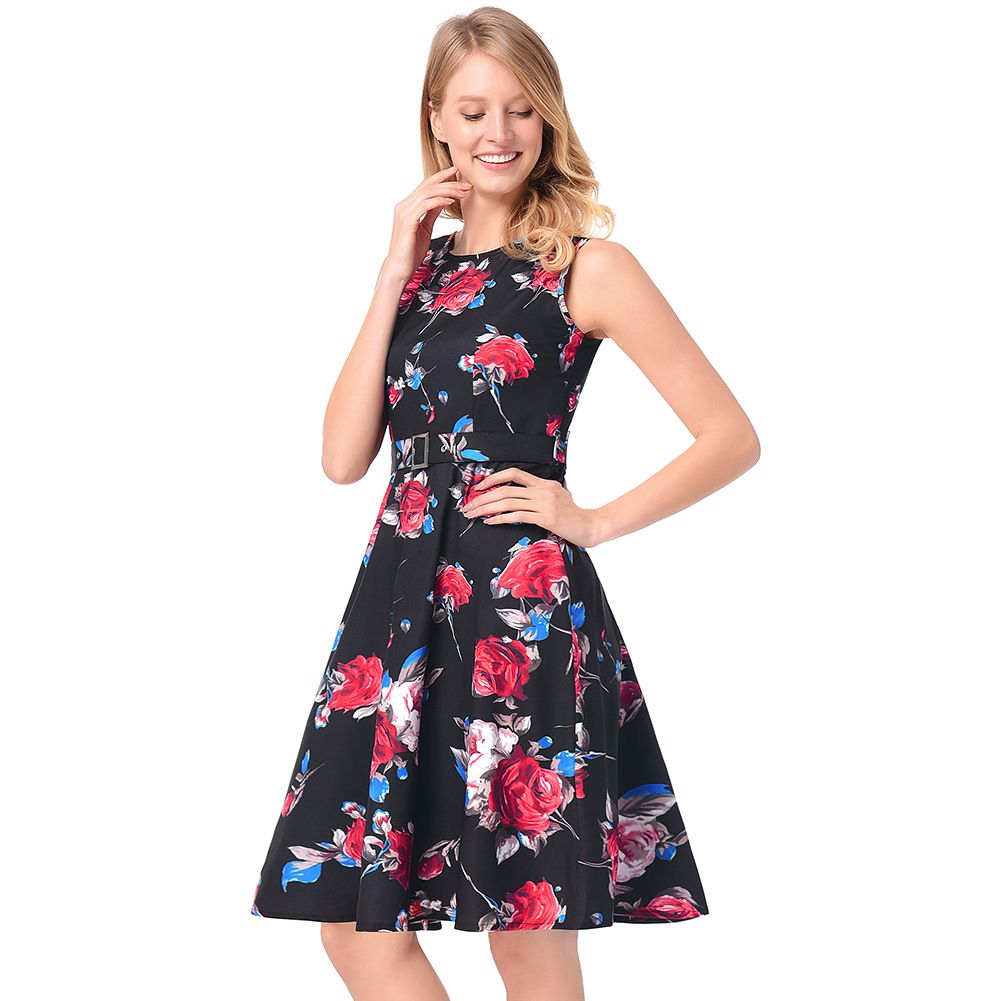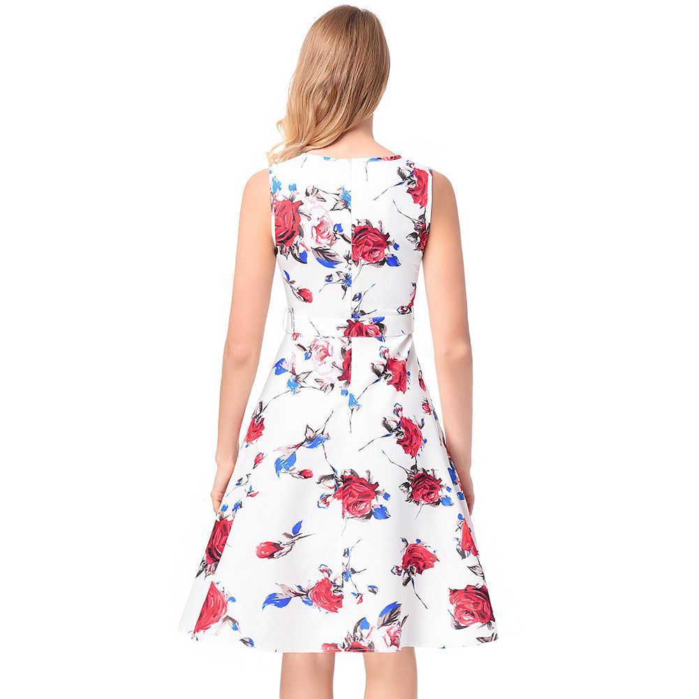 2025 early spring rose A-line skirt belt sleeveless print dress