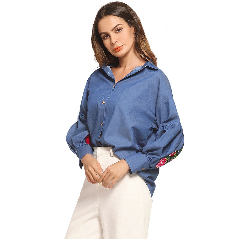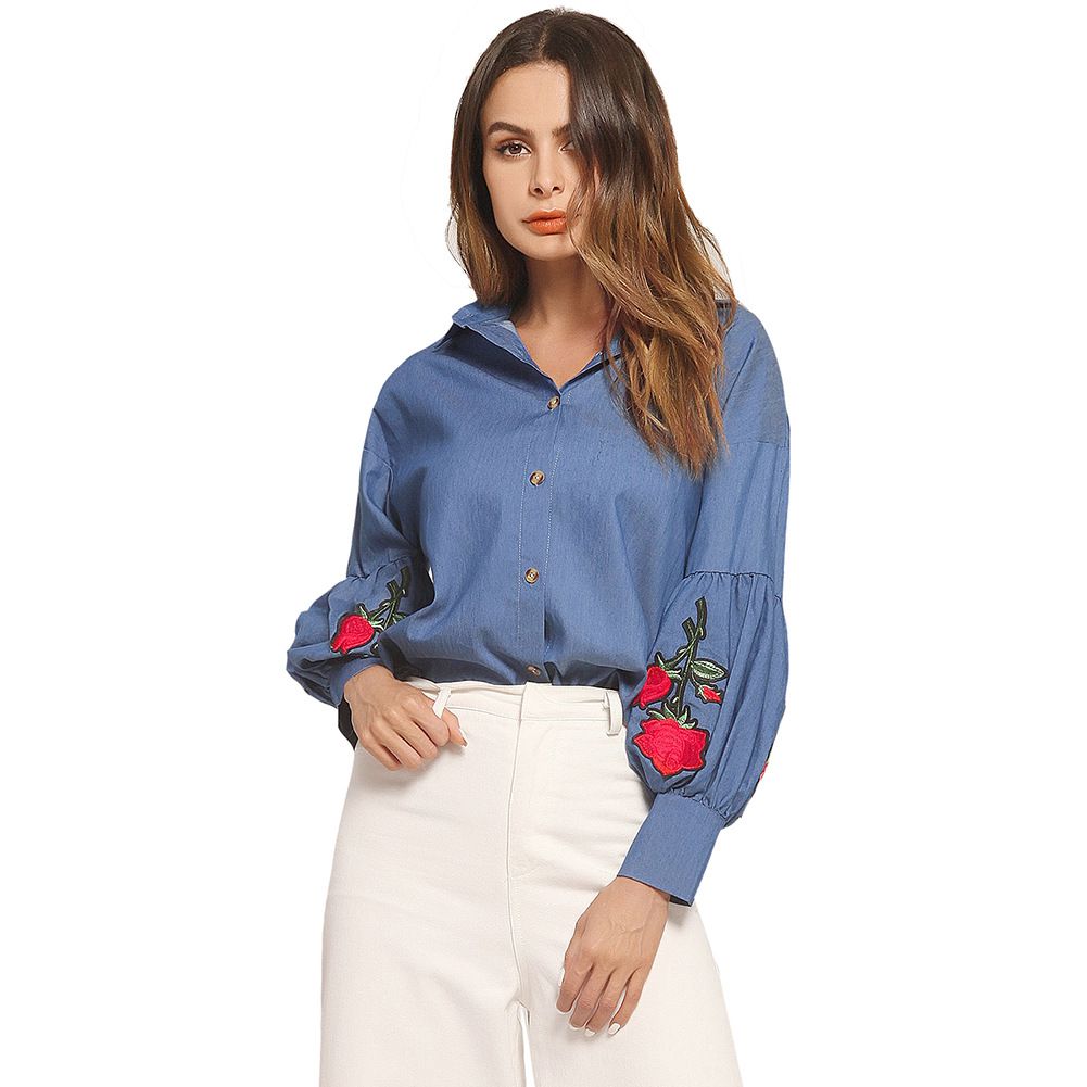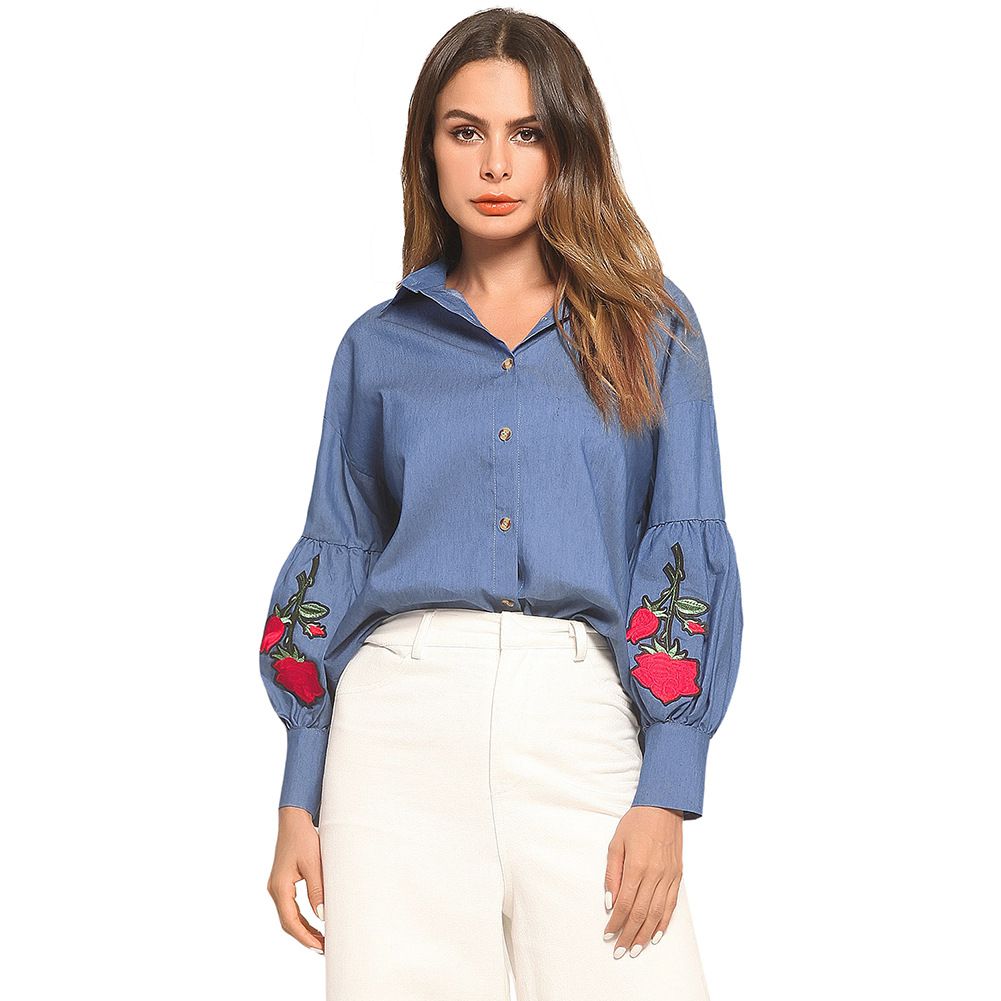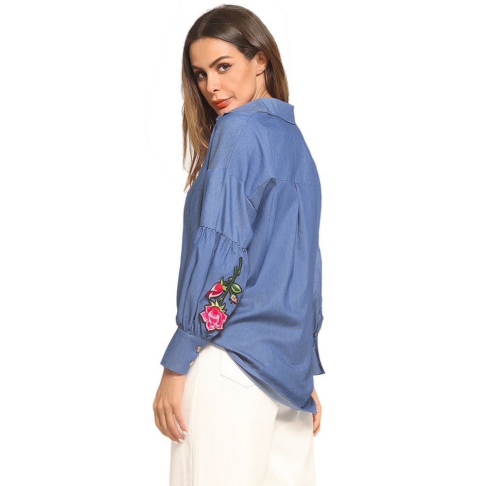 2025 new lantern cuffs rose embroidered chapter long sleeve loose denim shirt