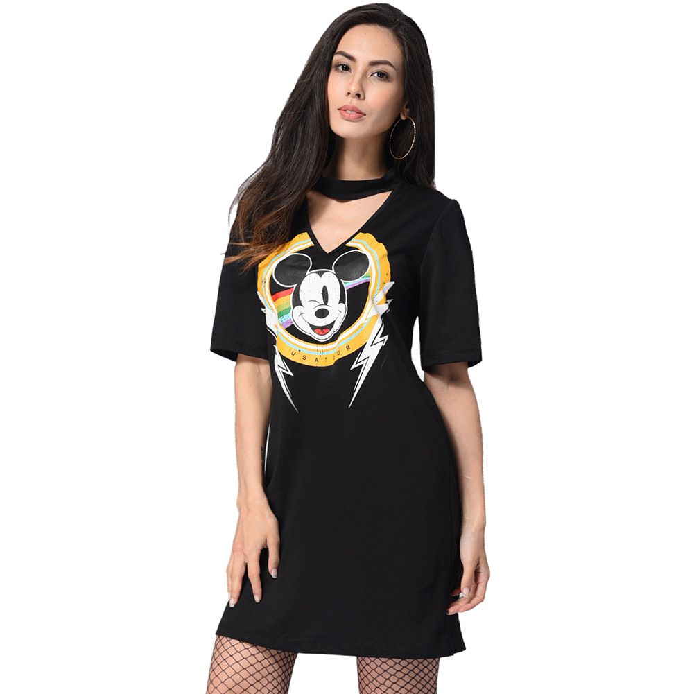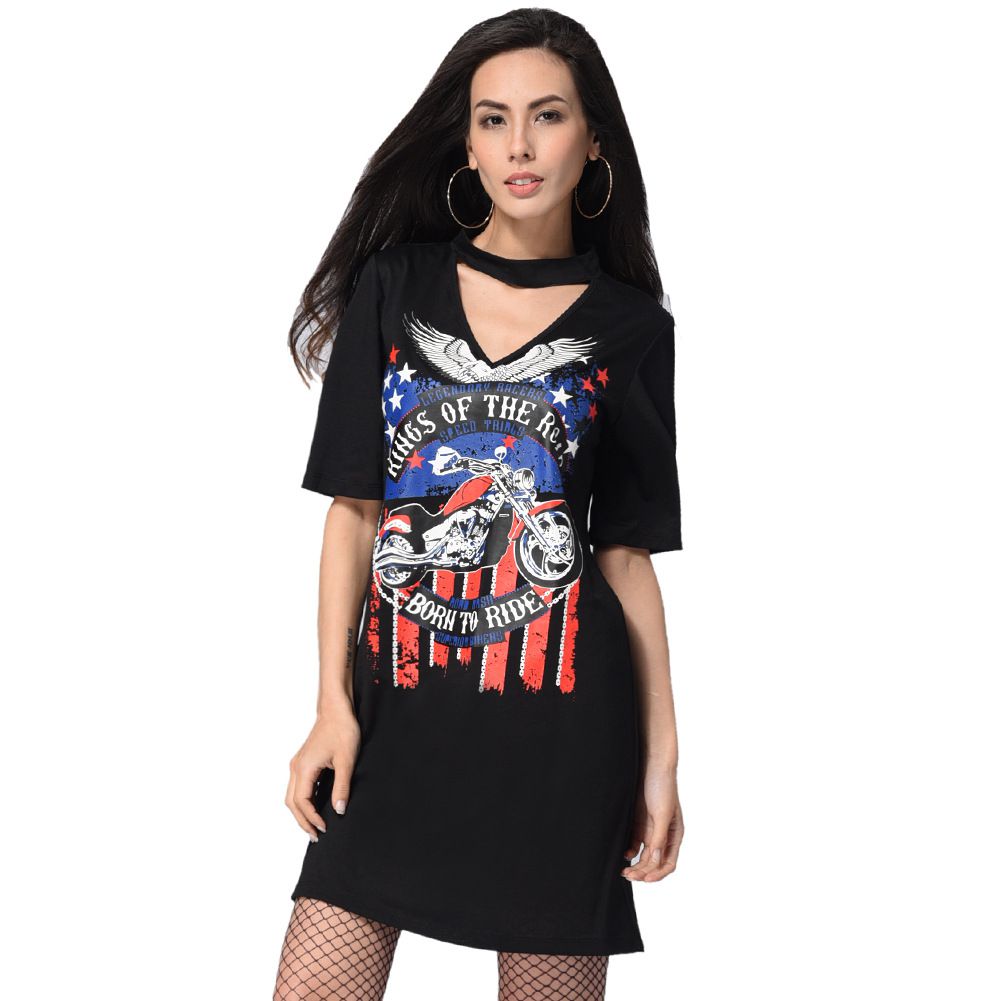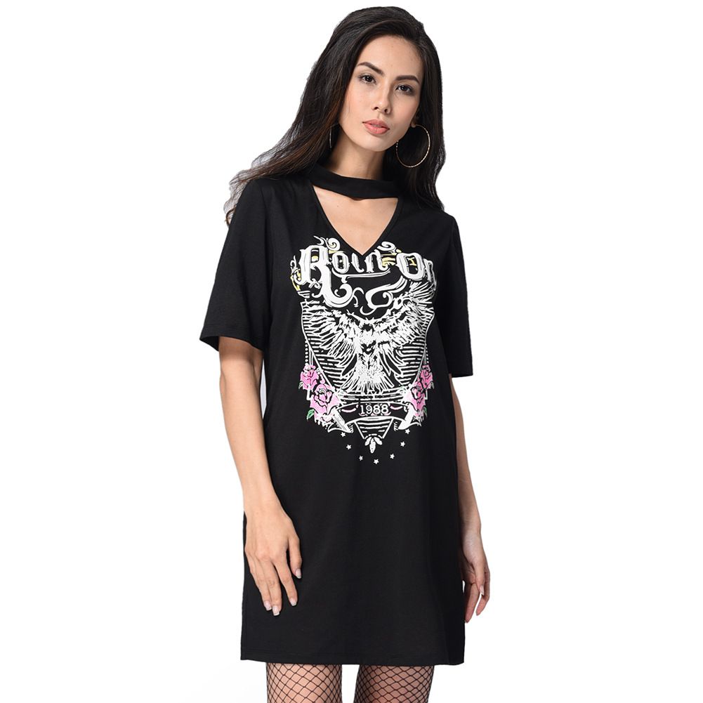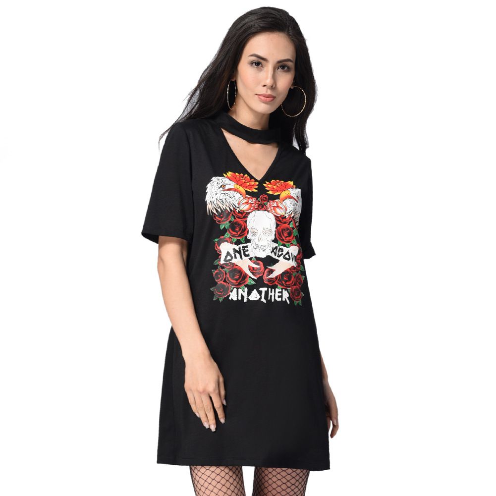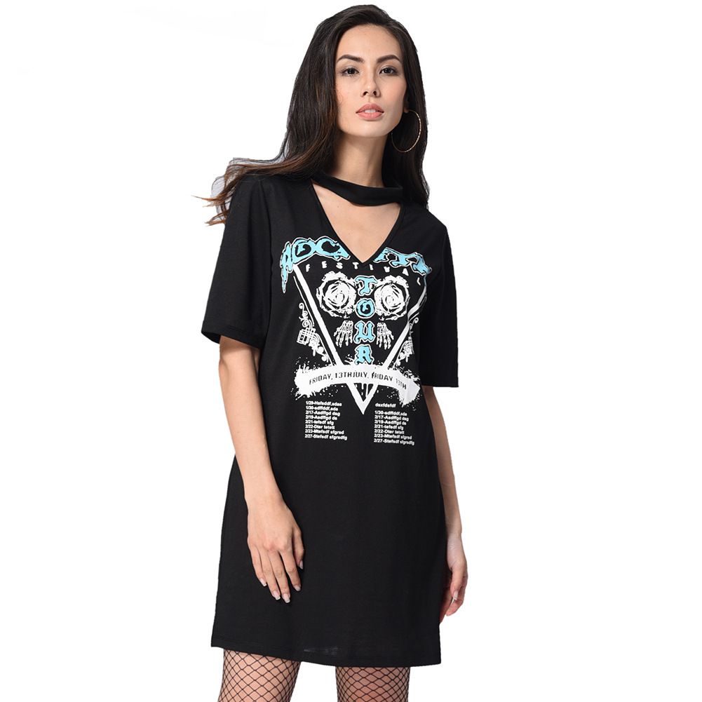 2025 spring and summer new hanging neck V-neck loose straight T-shirt print dress