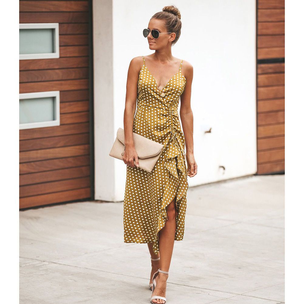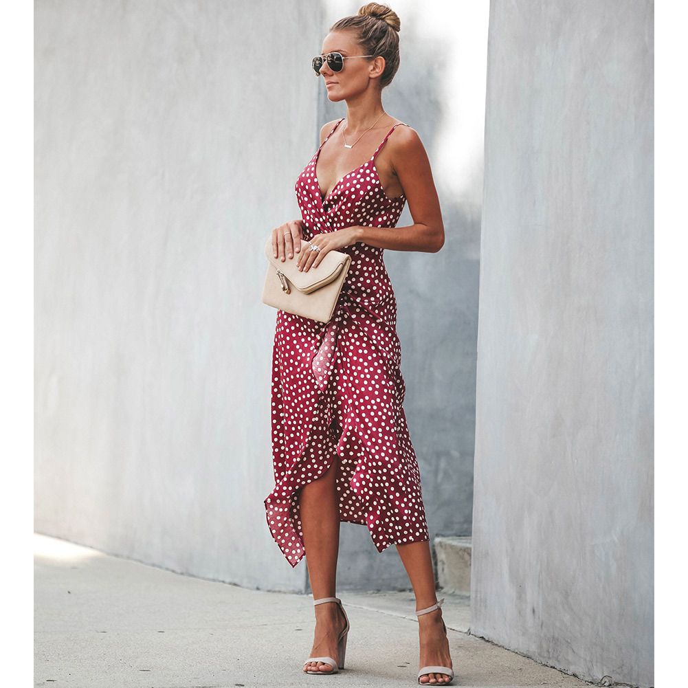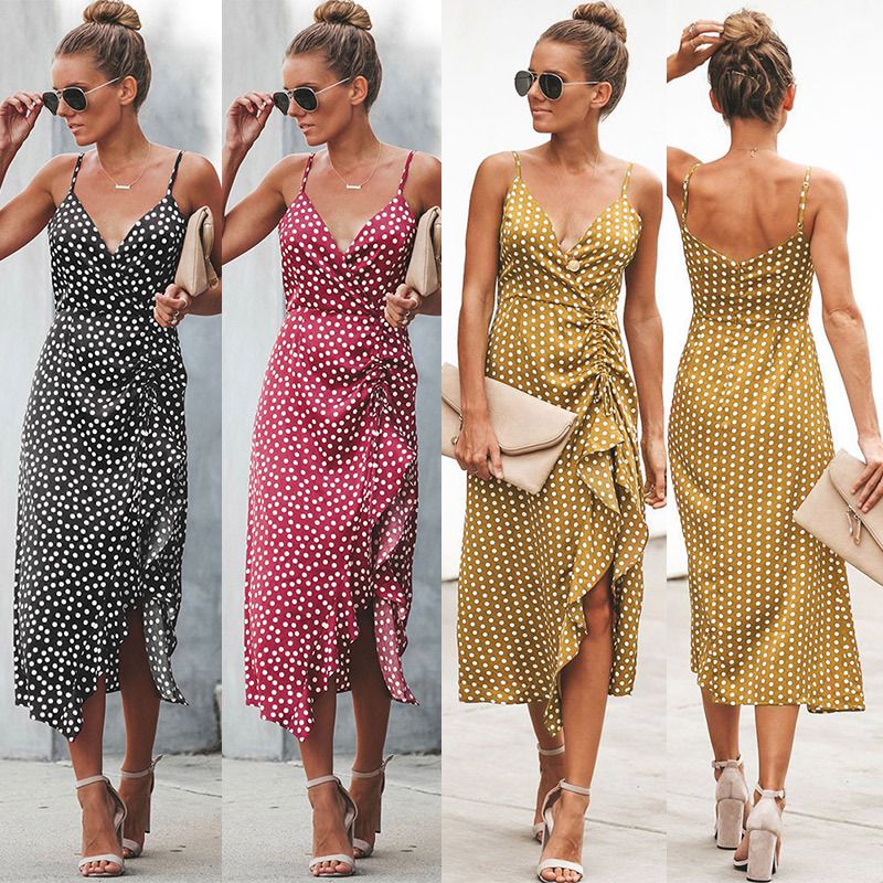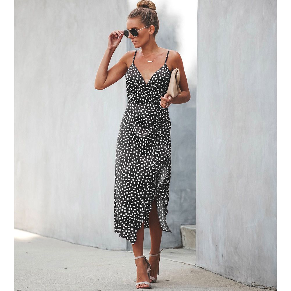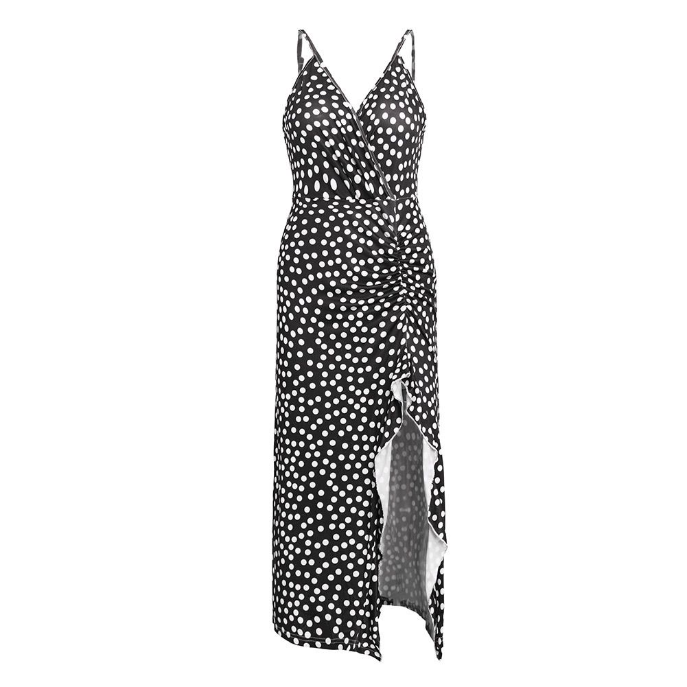 2025 women's spring and summer wave point sling V-neck swallowtail split sexy dress