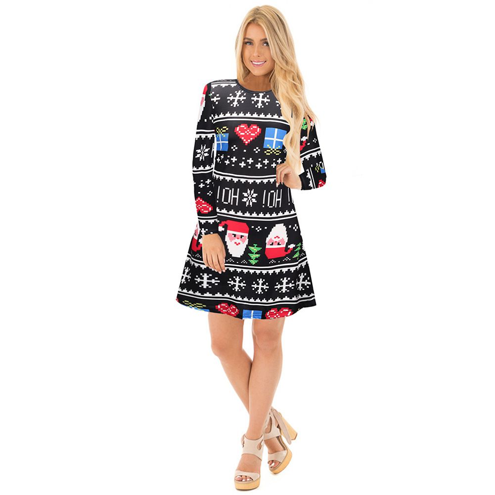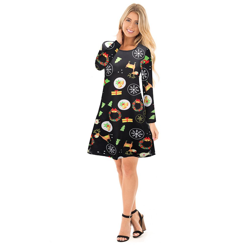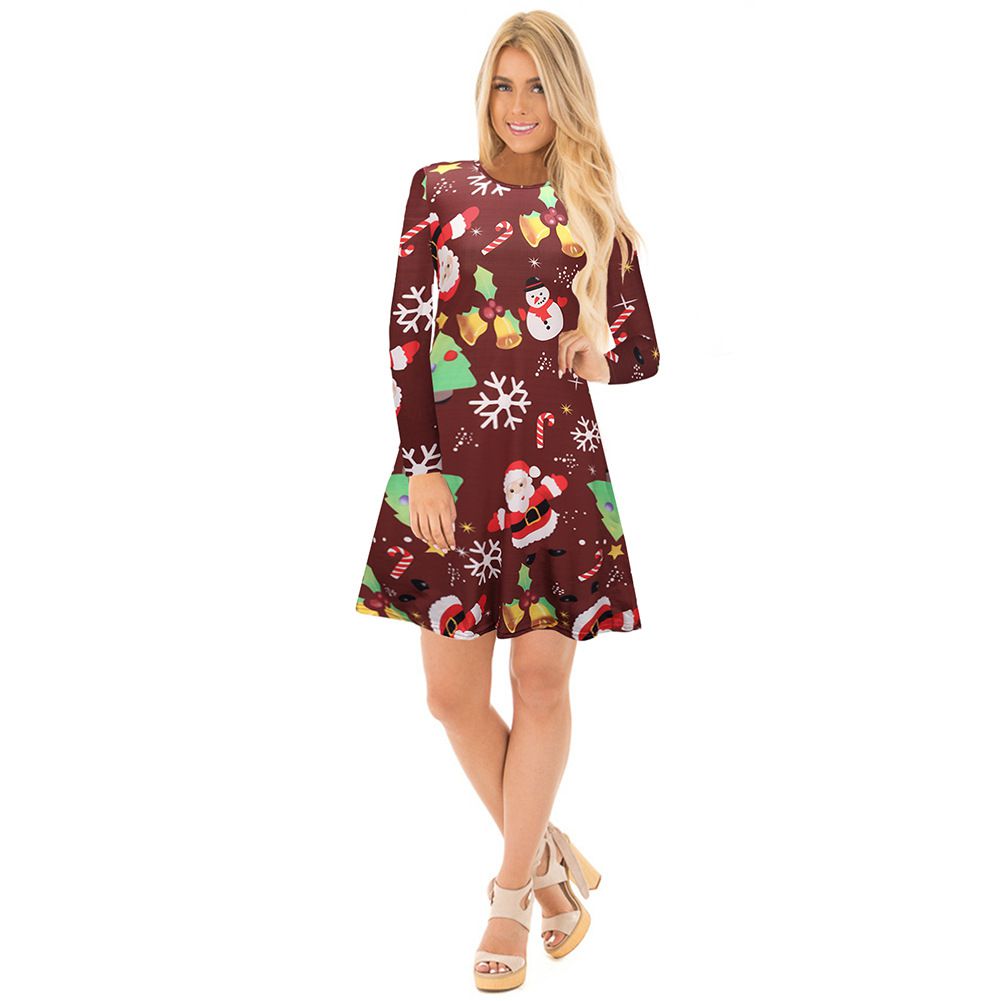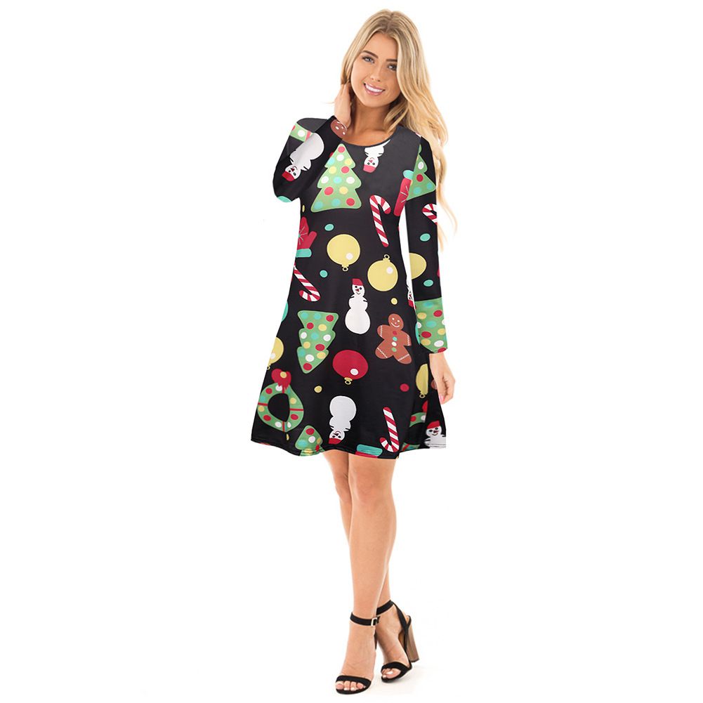 2025 Christmas Costume Christmas Print Skirt Long Sleeve Cartoon Dress Wholesale
