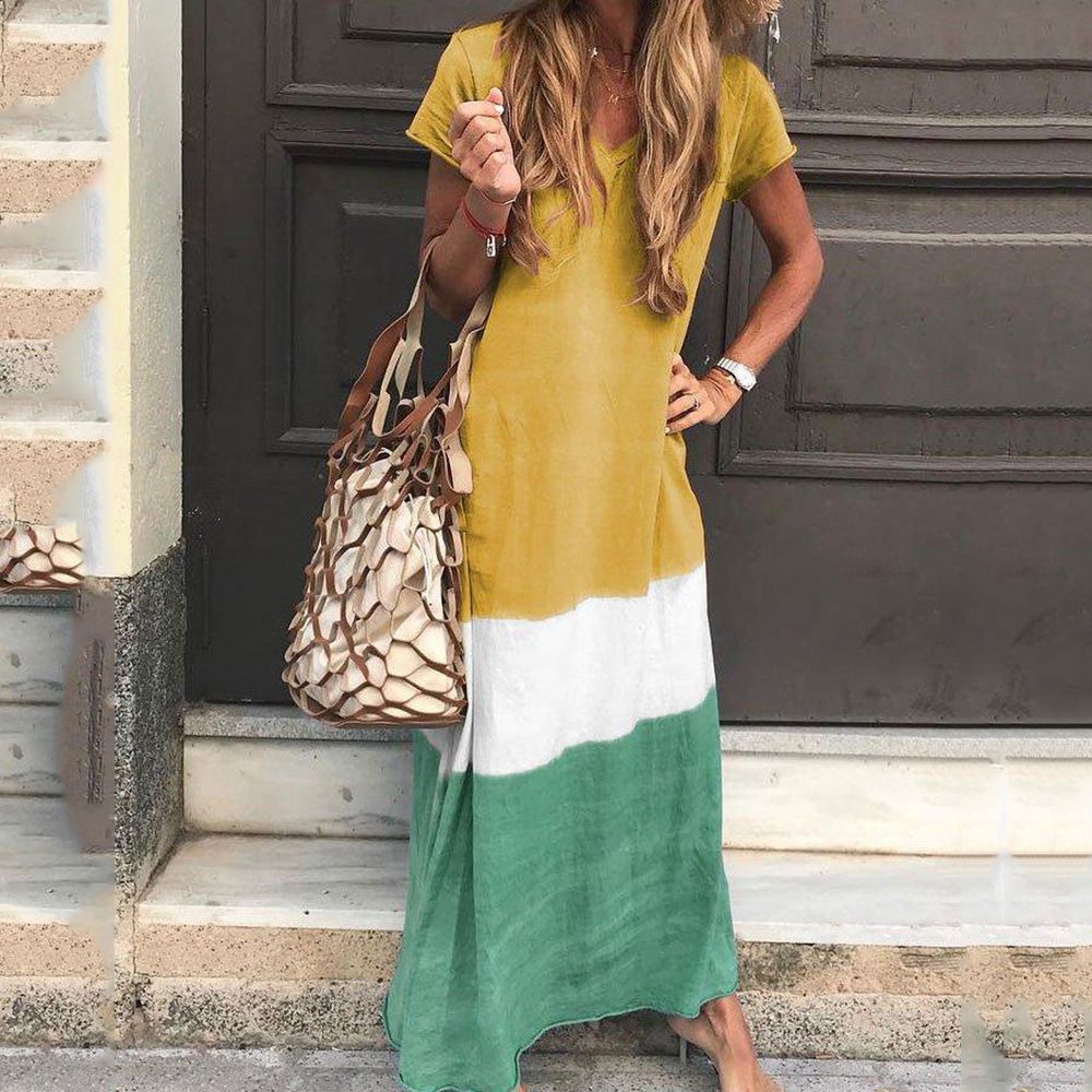 Summer new women's dress Simple contrast color loose short sleeve long dress